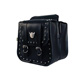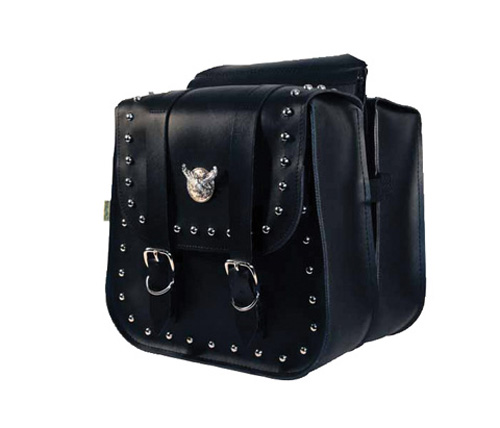 Nickel chrome studs, silver eagle pins with gold conchos, genuine roller-pin buckles and rich synthetic leather give the Studded Series its rugged good looks. The Studded Series has plastic reinforcing for better shape retention. The saddlebags are supplied with heavy-duty cable ties and laces for your choice of mounting options. The tool pouch is mounted with a new hook-and-loop strap and the sissy bar bag uses an easy-tie-on lace mounting system.