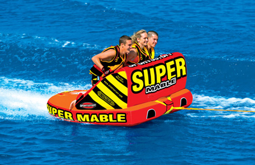 The next generation Super Mable from Sportsstuff is here! Built for 1 to 3 riders, this new and improved classic towable will continue to impress you with a variety of different riding options. Featuring Dual Tow Points, you can go for a wild ride utilizing the comfy backrest or tow it the opposite direction for a chariot style blast on the water you’ll never forget. This action packed towable comes equipped with comfy EVA Foam Seating Pads and a magnitude of Double Webbing Foam Handles with Knuckle Guards to enable tons of different riding positions. The addition of Air Cushioned Side Walls will keep you on board while the Redesigned Backrest and new Custom Graphics make this uniquely shaped towable dressed to impress. Experience an exciting day of towable action on the Super Mable or put your feet up and relax using it as a deluxe lounge.
