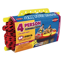 4100-pound (1.86 Mg) break strength! This heavy-duty rope is perfect for towing any tube with up to 4 riders. Features a molded plastic caddy for easy storage. 60 Feet (18.3 meter) length.