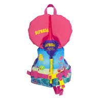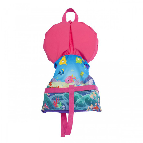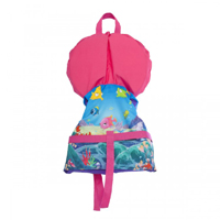 Closed sided vest with ocean inspired graphic Front zipper with waist belt and crotch strap included for extra safety Segmented head rest and grab handle Fits infant less than 30 lbs. USCG approved TYPE II Brand:KWIK TEK