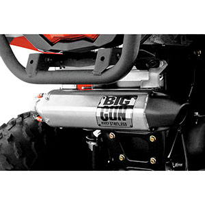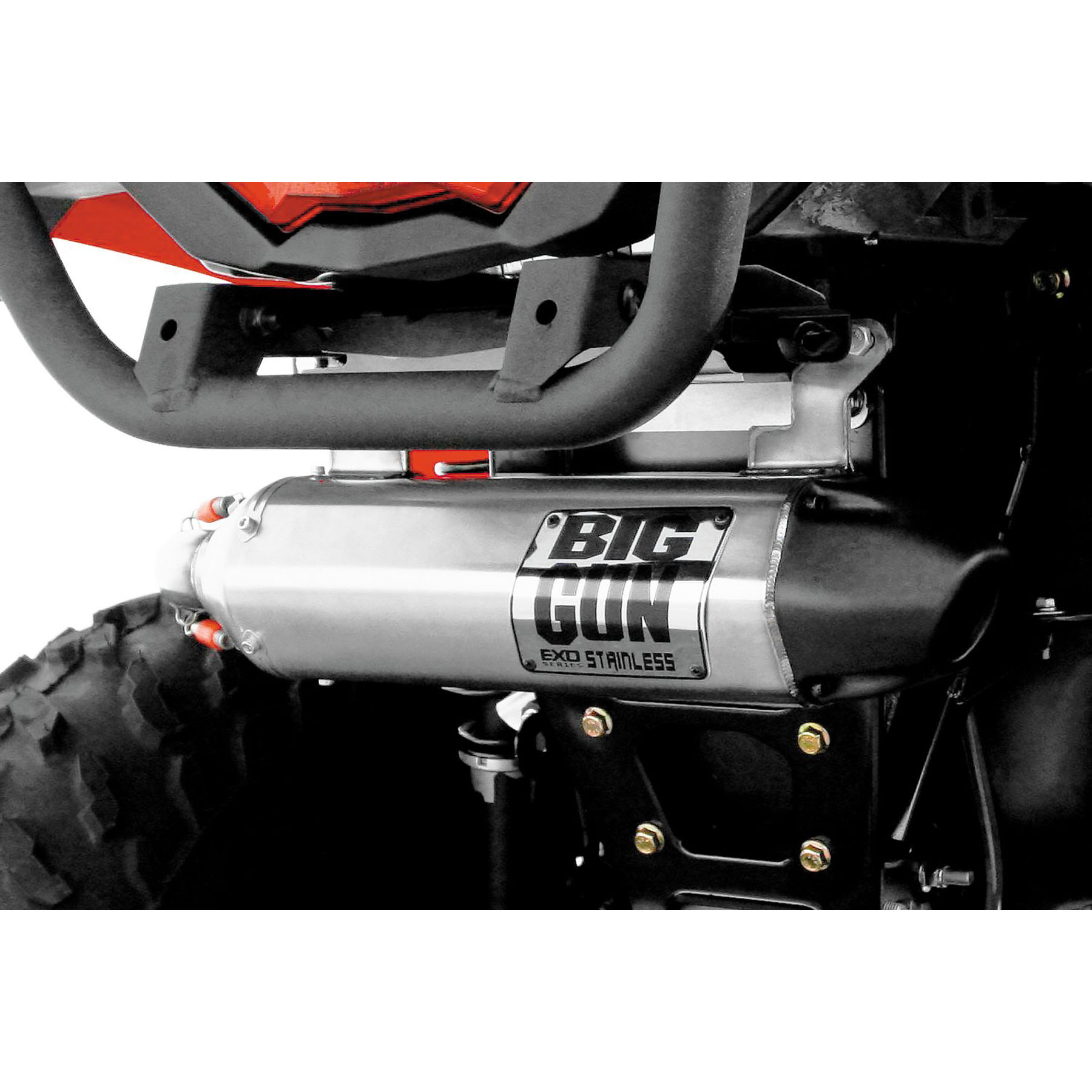 EXO Stainless™ Slip-On by Big Gun®. EXO Stainless is the most durable exhaust in Big Gun lineup. Constructed of high-strength 304 stainless steel from front to back, EXO Stainless is sure to withstand even the most brutal of riding conditions and use. Big Gun took the original EXO Series and swapped out the aluminum muffler for a stainless muffler, replaced the aluminum base plate with a TIG-welded stainless steel plate and added a trick looking stamped stainless badge to top it off.