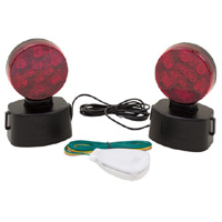 Contents: 2 stop/tail/turn LED lights, transmitter with standard flate 4 wire vehicle trailer light connector and complete trilingual instructions