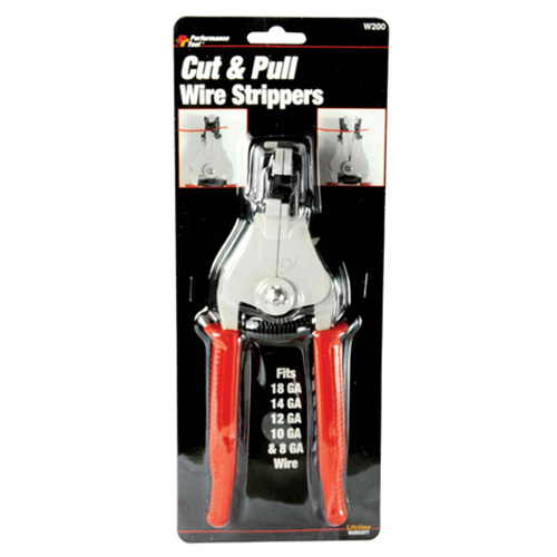 Cuts and removes insulation from wire with a single squeeze of the handle Accepts 18, 14, 12, 10, and 8 gauge wire Heavy duty construction with vinyl hand grips Display packaged Brand:PERFORMANCETOOL