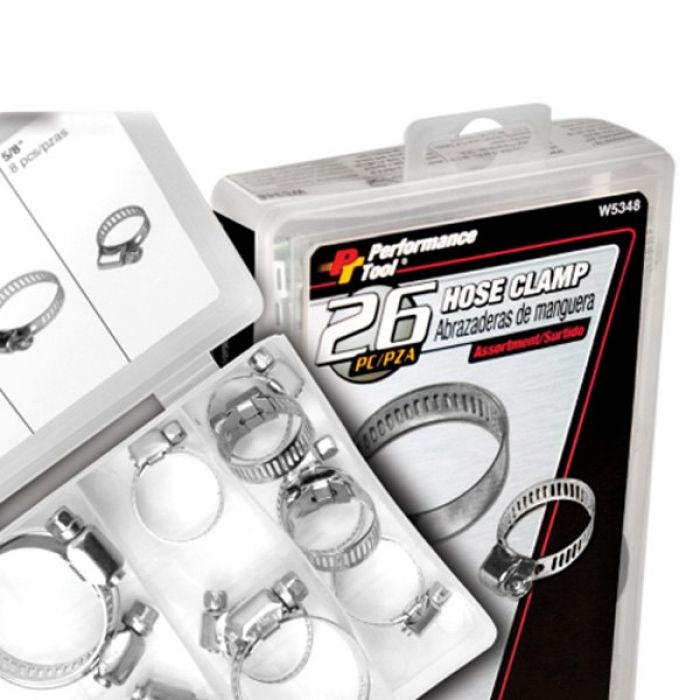 26 piece hose clamp assortment Contains 6 popular sizes of hose clamps Convenient re-sealable plastic case Brand:PERFORMANCETOOL