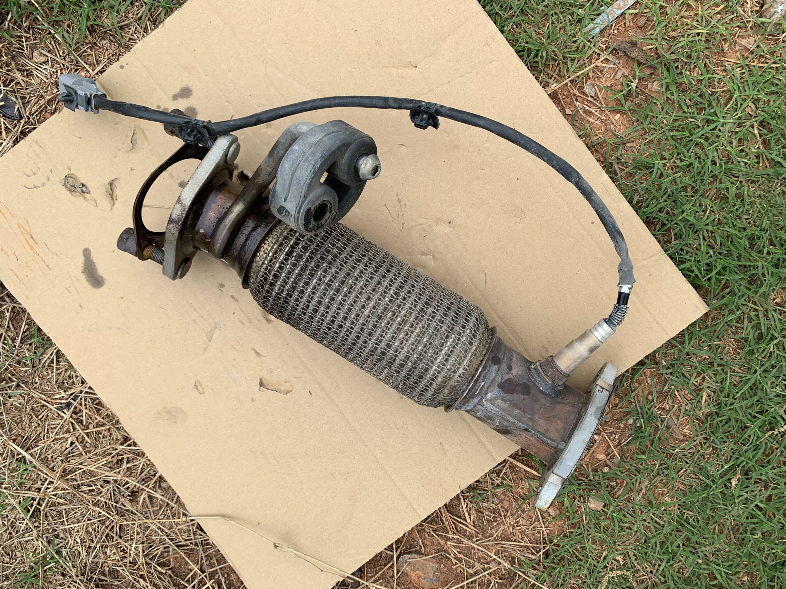 OEM front exhaust/flex section with oxygen sensor. Normal heat discoloration and surface oxidation are expected on used exhaust parts. Review photos closely.